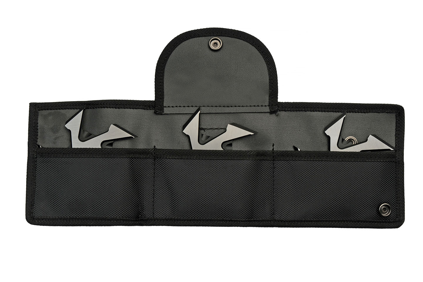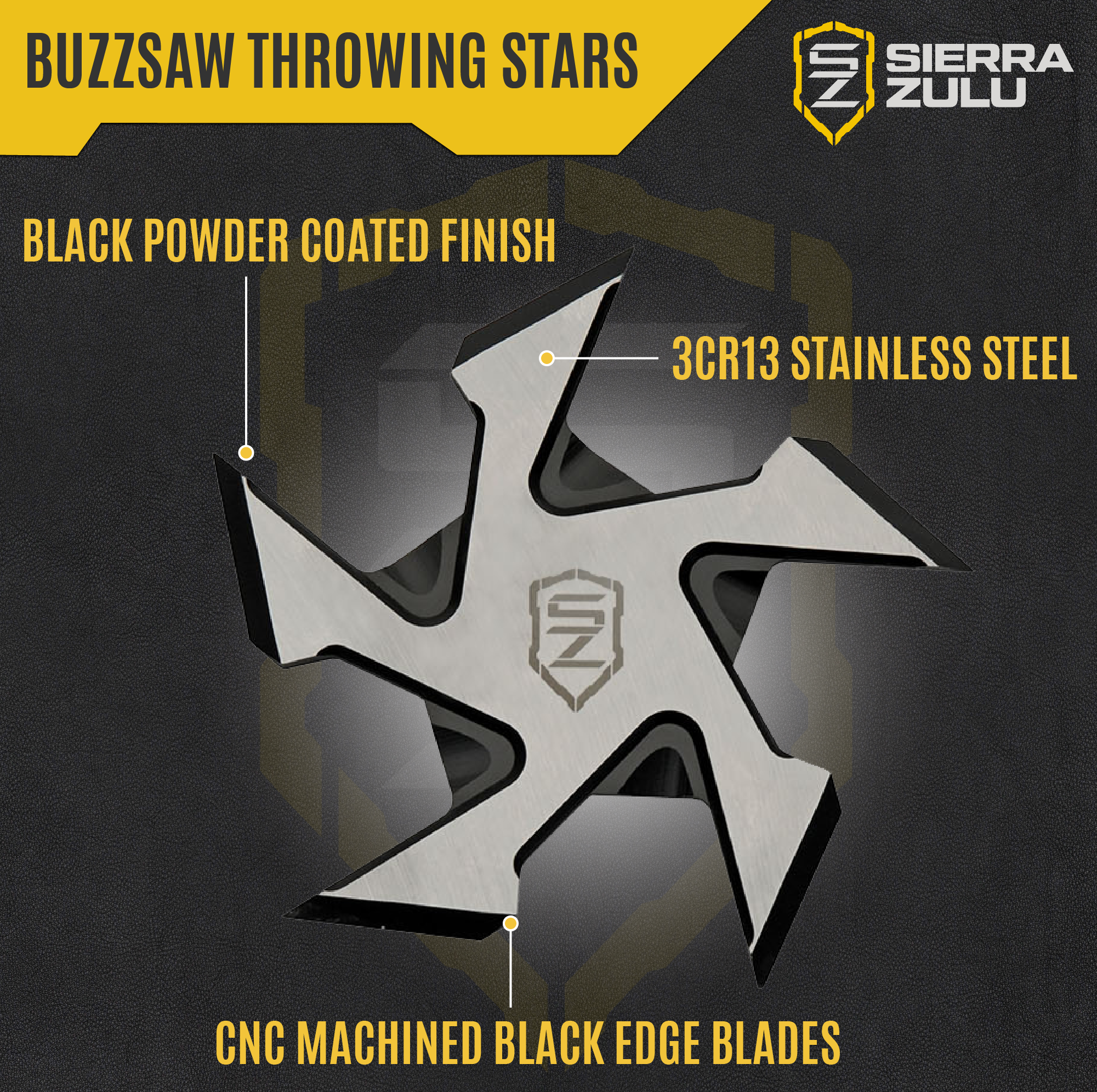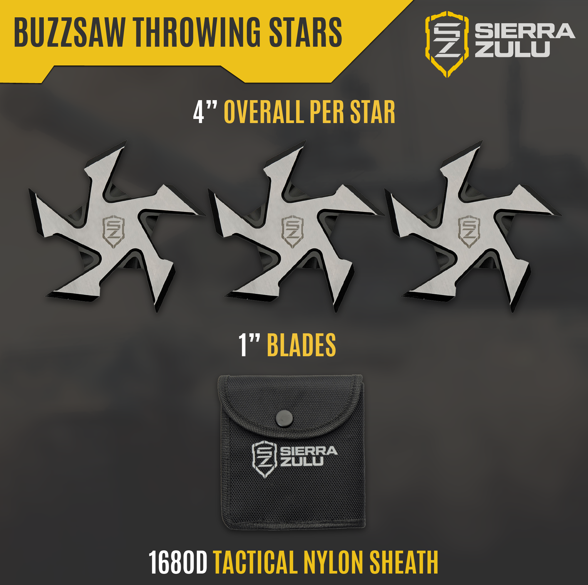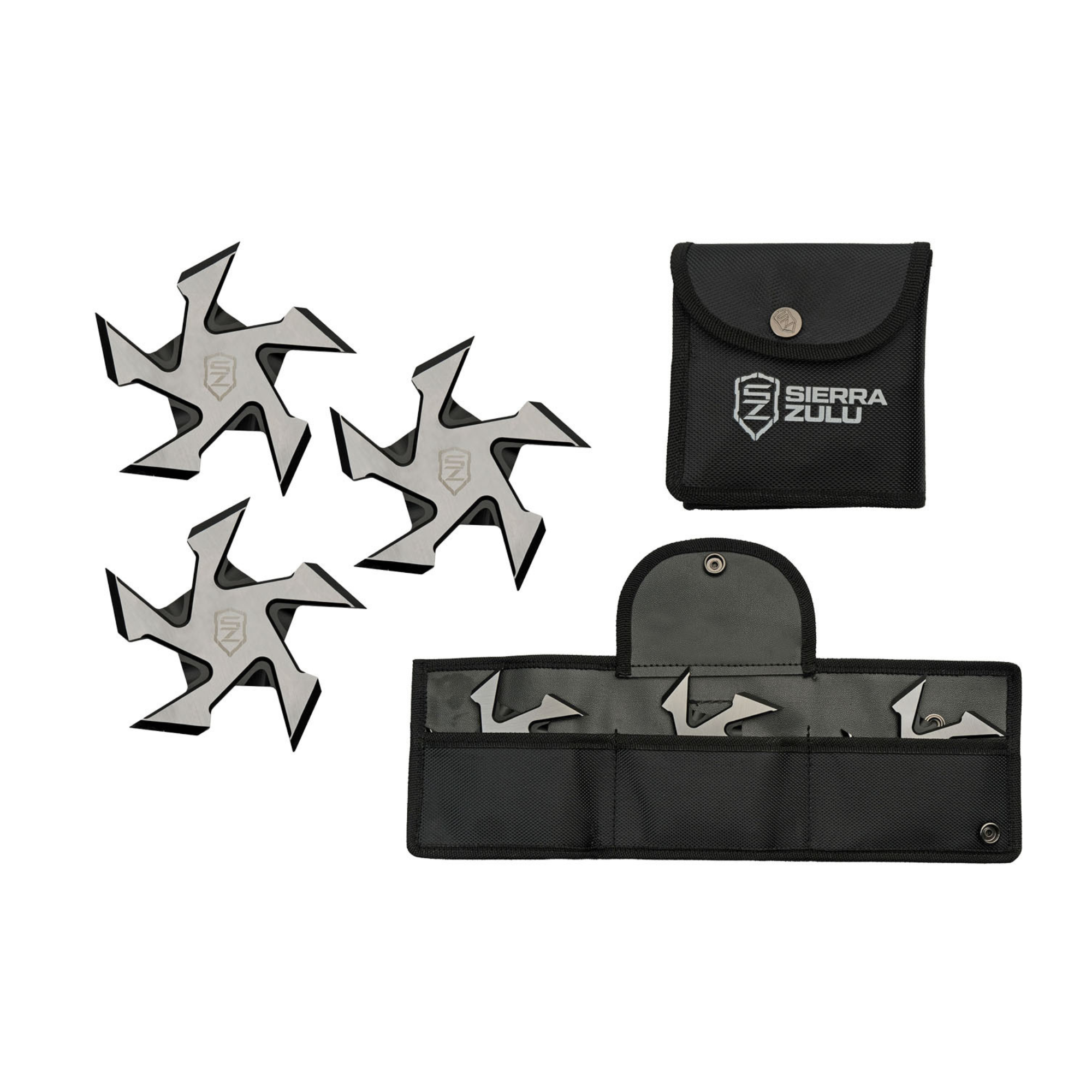 The Sierra Zulu 3-piece throwing star set features an intensely durable design with its intimidating 5-point star blades making it the ideal tactical thrower for all of your self-defense, tactical and recreational target throwing needs. Featuring extremely durable coated 3CR13 stainless steel blades expertly weighted and balanced, these defensive throwers will be sure to last through all of the harshest conditions. Accompanied with an industrial strength nylon carrying sheath with belt loop this throwing set is always ready for any and all on-the-go action.