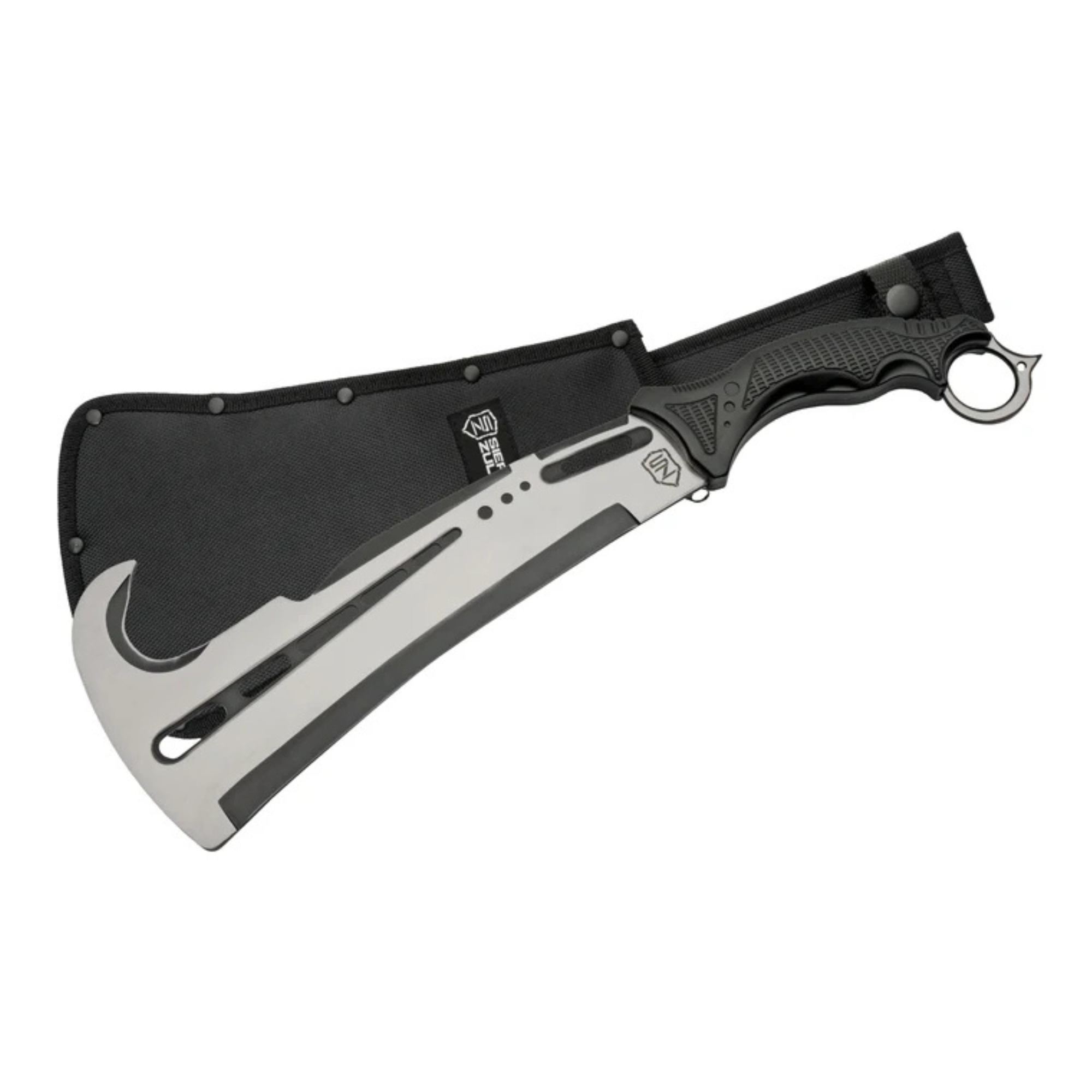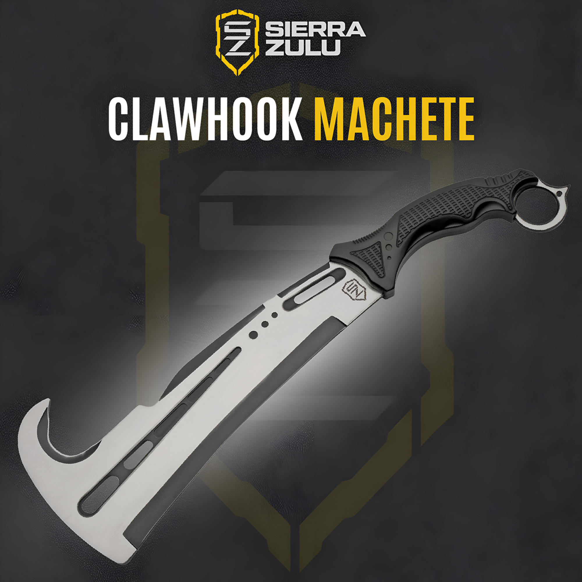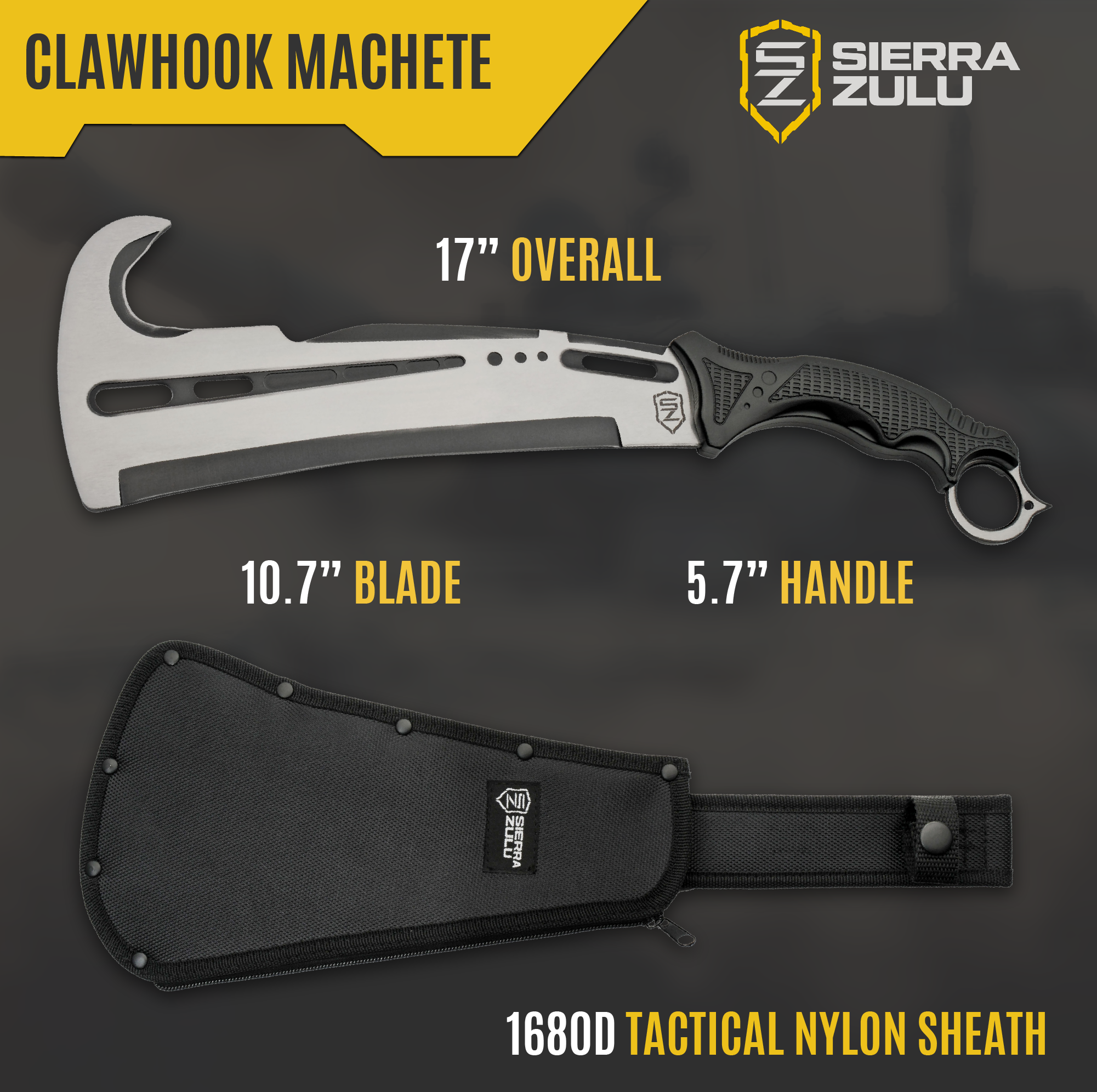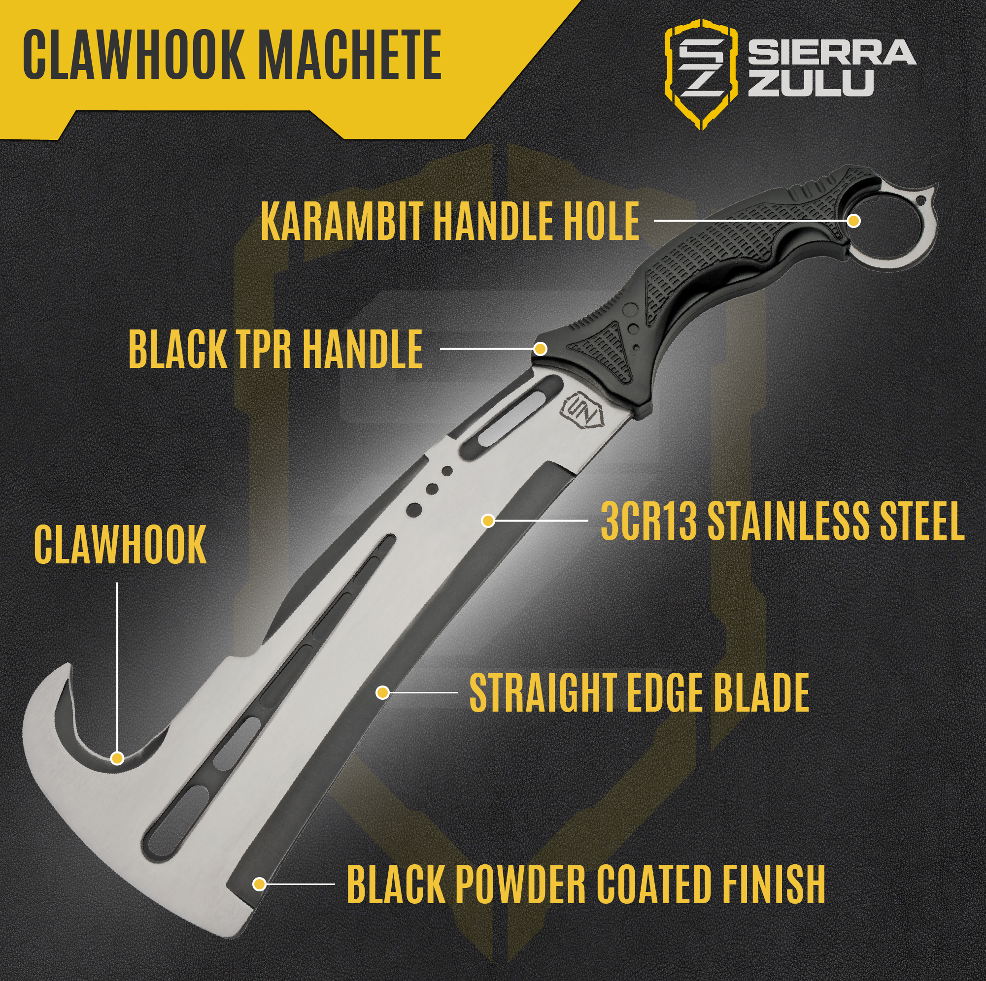 The Sierra Zulu Clawhook Machete shows off a uniquely intimidating design with its intense modified cleaver blade and a gut-hook extension making it the ultimate machete for all of your outdoor hunting, camping, hiking, bushcraft, tactical and self-defense needs. Featuring an extremely durable coated 3CR13 stainless steel blade and a slip resistant textured TPR handle, this outdoor knife will go the distance for all your toughest cutting, sawing, slicing and piercing jobs. Accompanied with the versatile industrial strength nylon carrying sheath, this machete is always ready for any and all on-the-go action.
